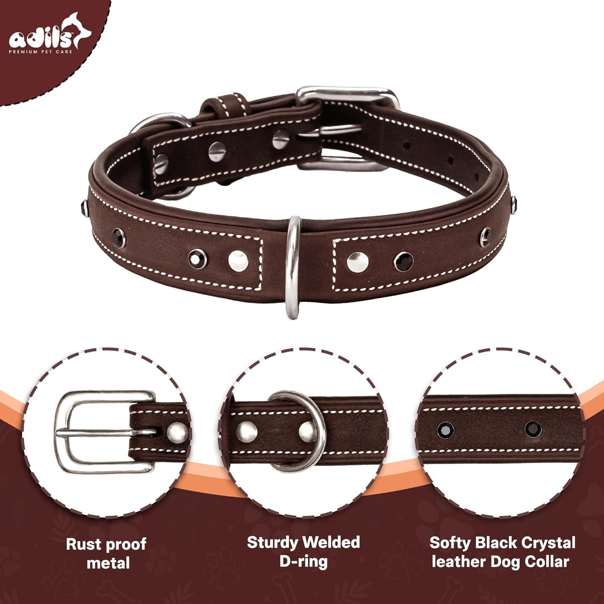 Adil'S Studded Softy Leather Dog Collar 1inch Width Suitable for Small, Medium & Large Dogs with Strong Metal Buckle & D-Ring for leashes - BLACK / SMALL
